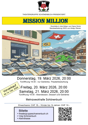 Vorverkauf (ab 14. Februar 2026) Volg, Schönenbuch Do., 19. März : Eventfrog Fr., 20. März : Eventfrog Sa., 21. März : Eventfrog |